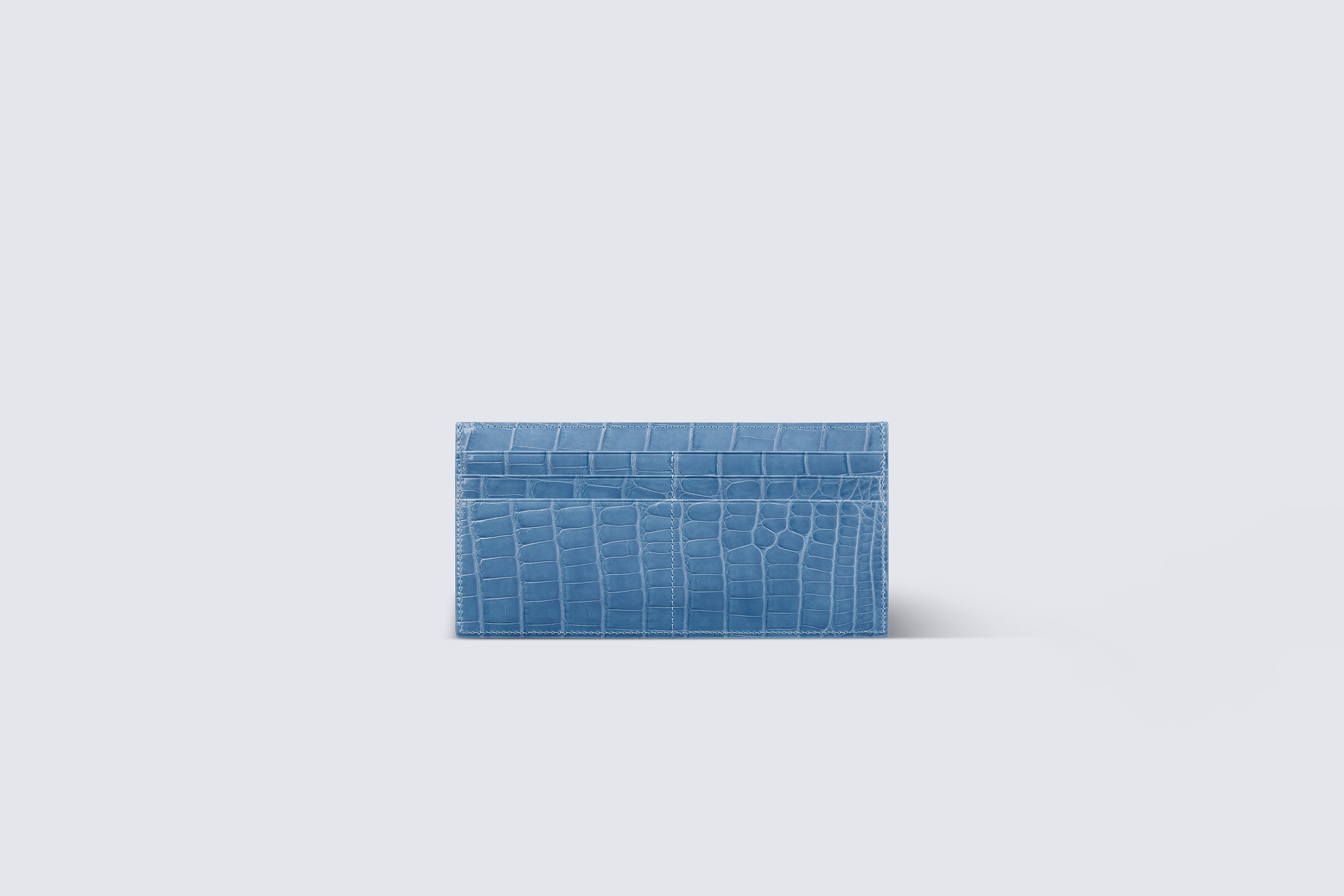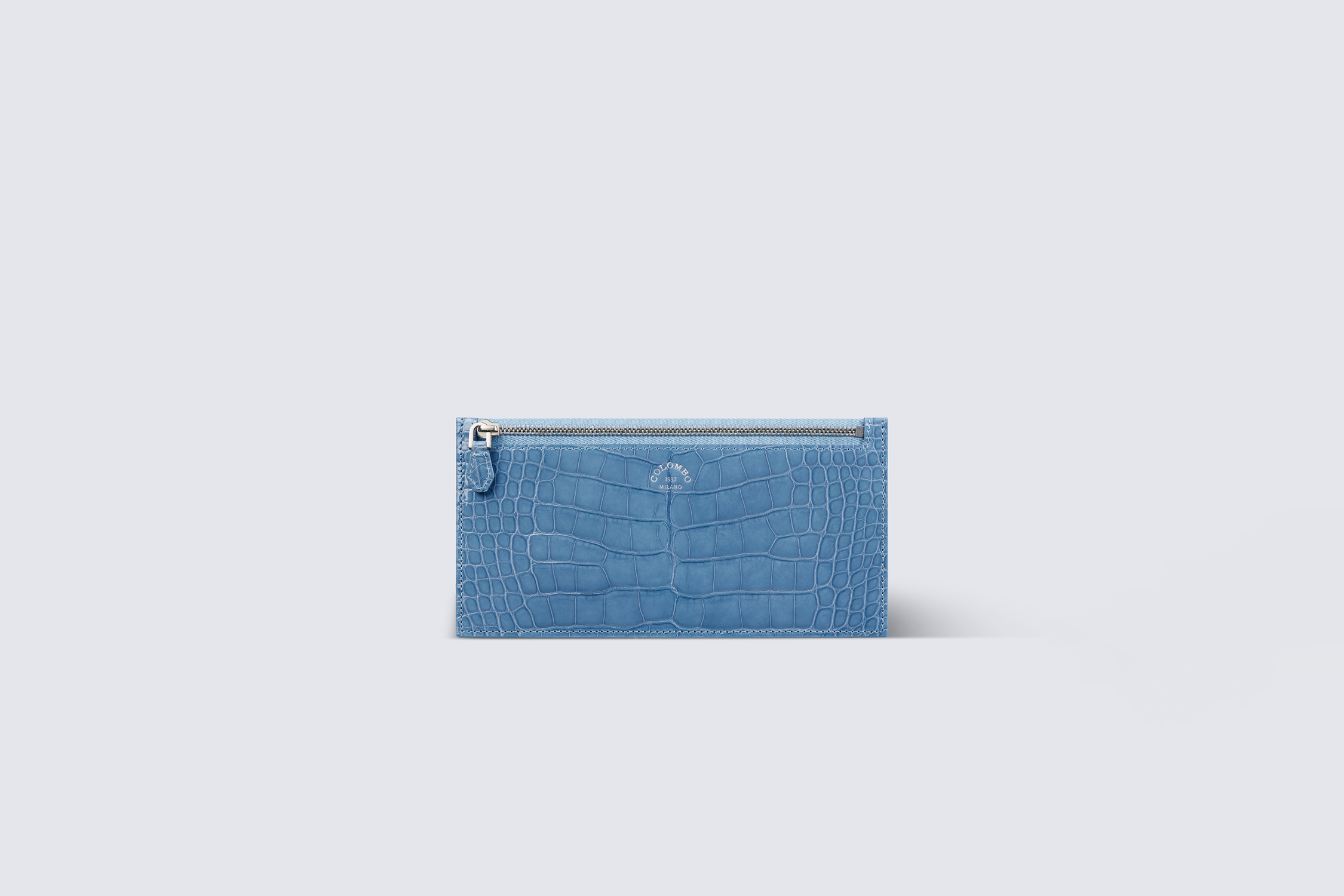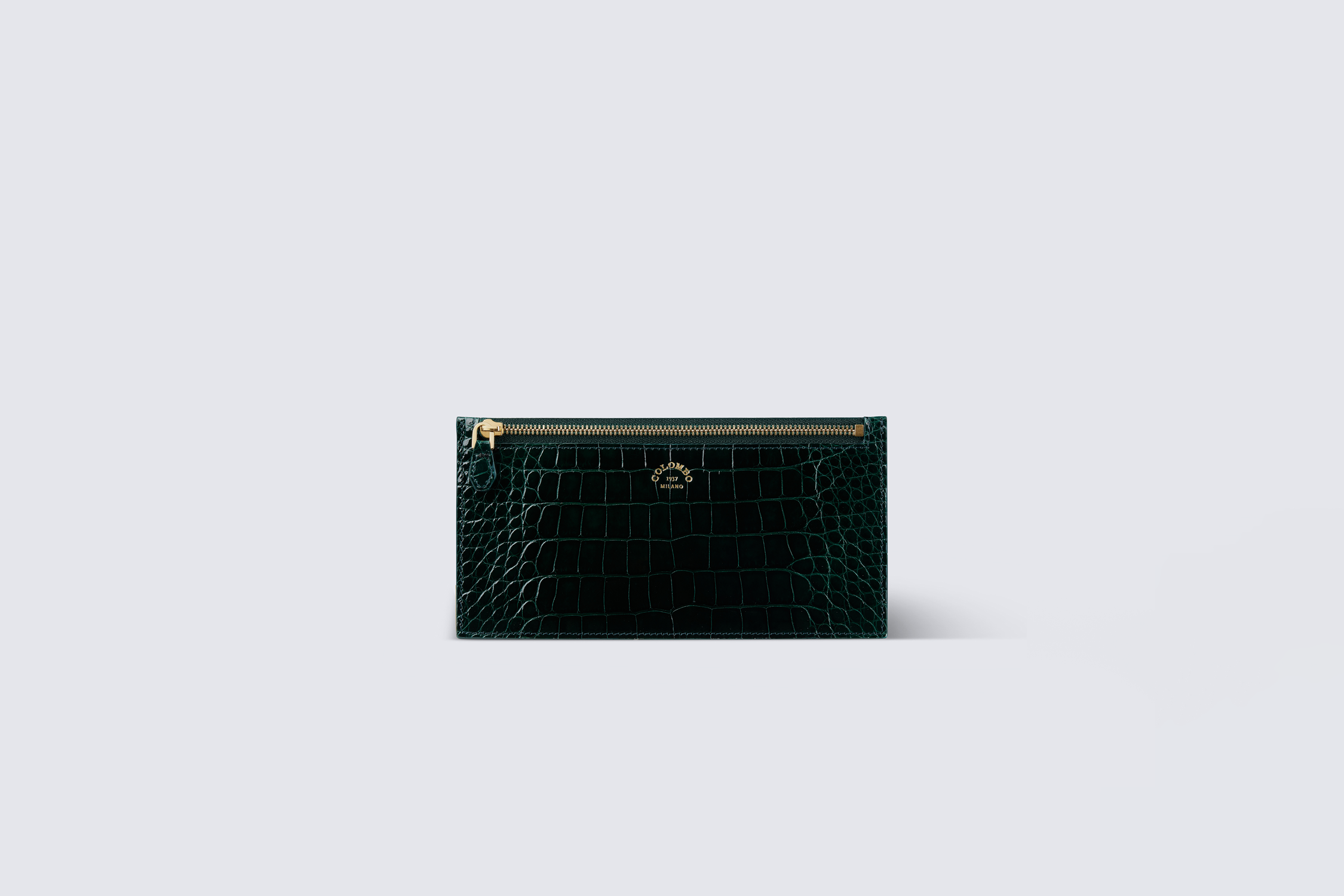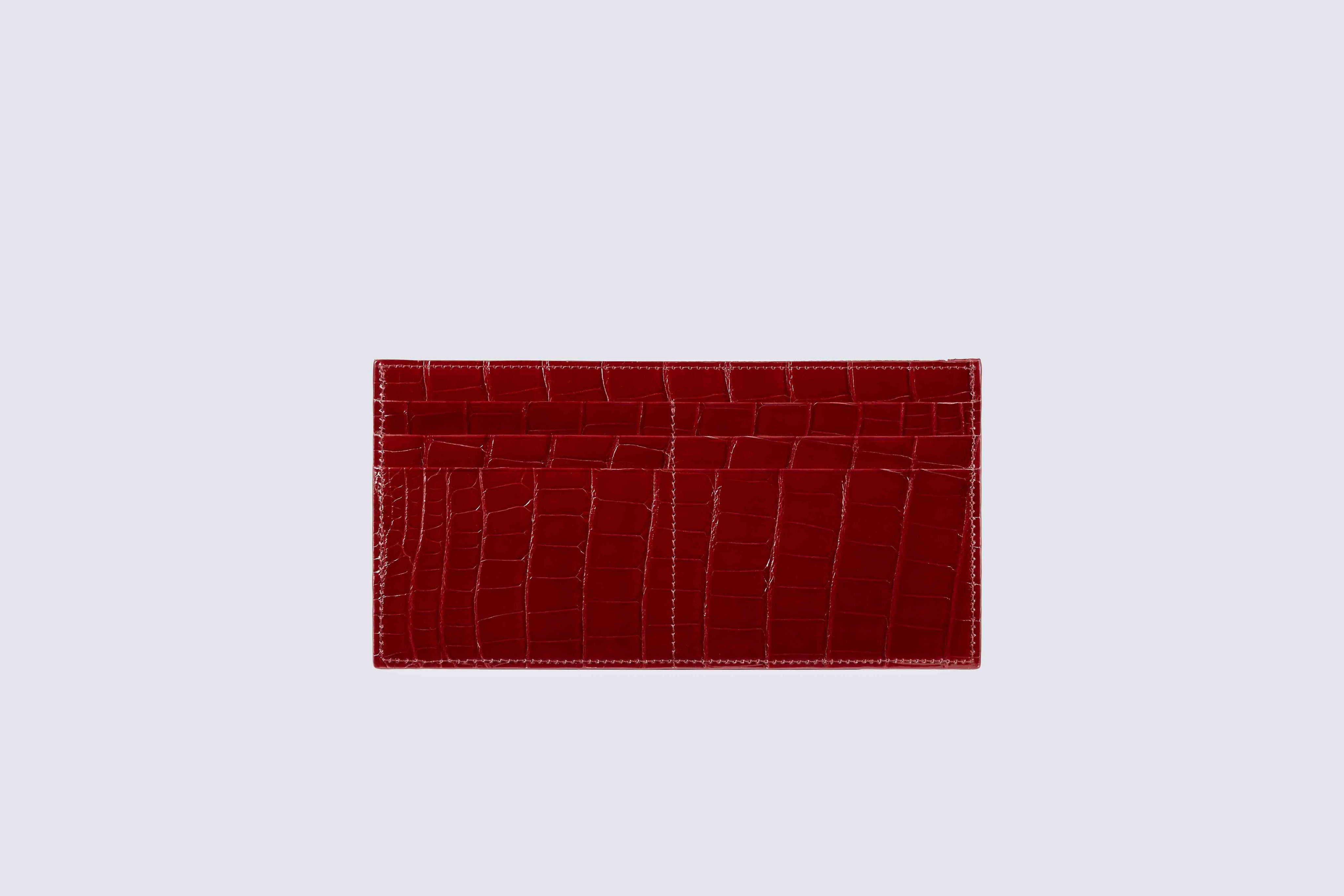This model belongs to the long wallet line. It features a zip closure that opens to reveal an internal compartment. On the back, it includes six card slots.