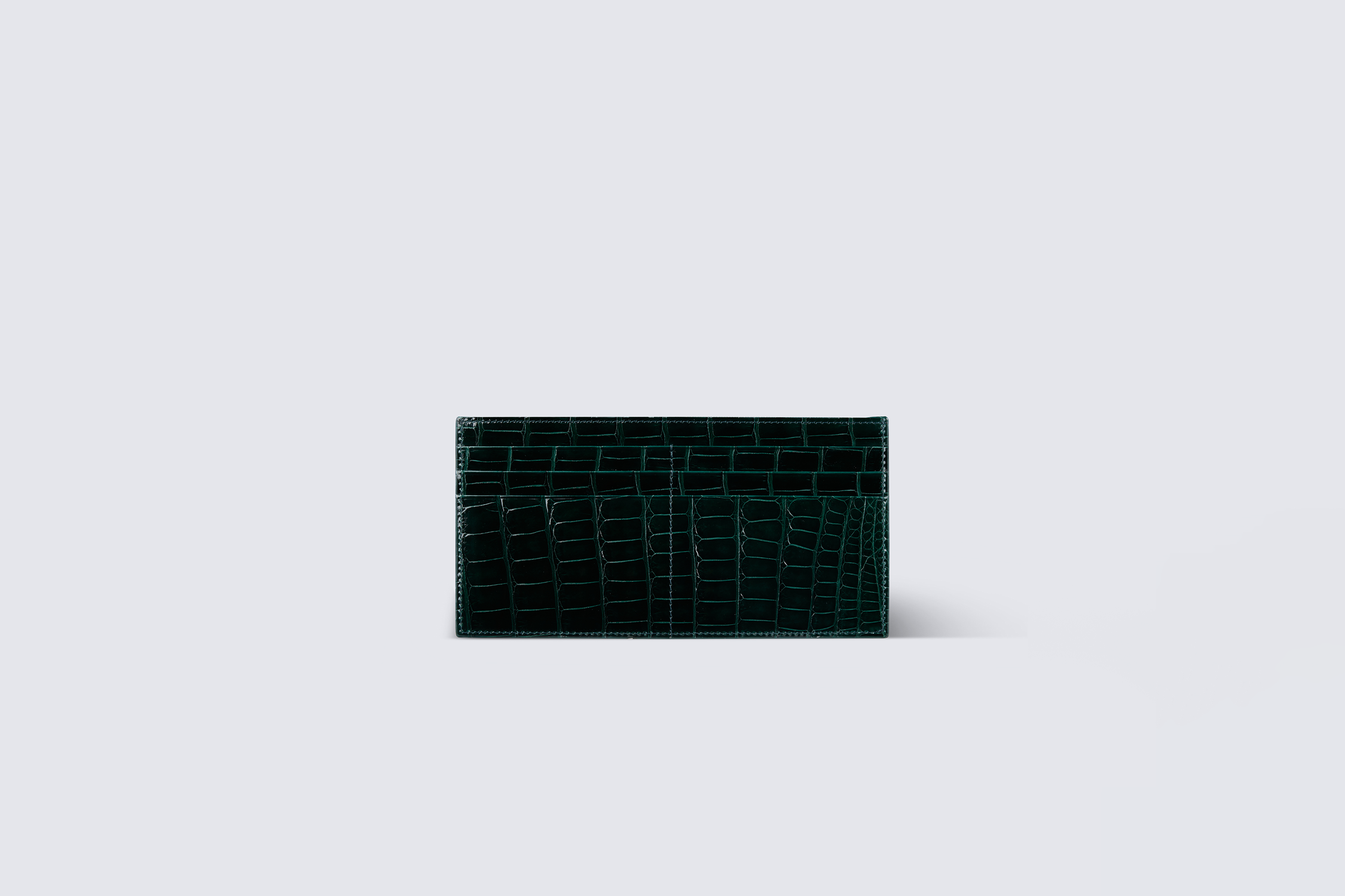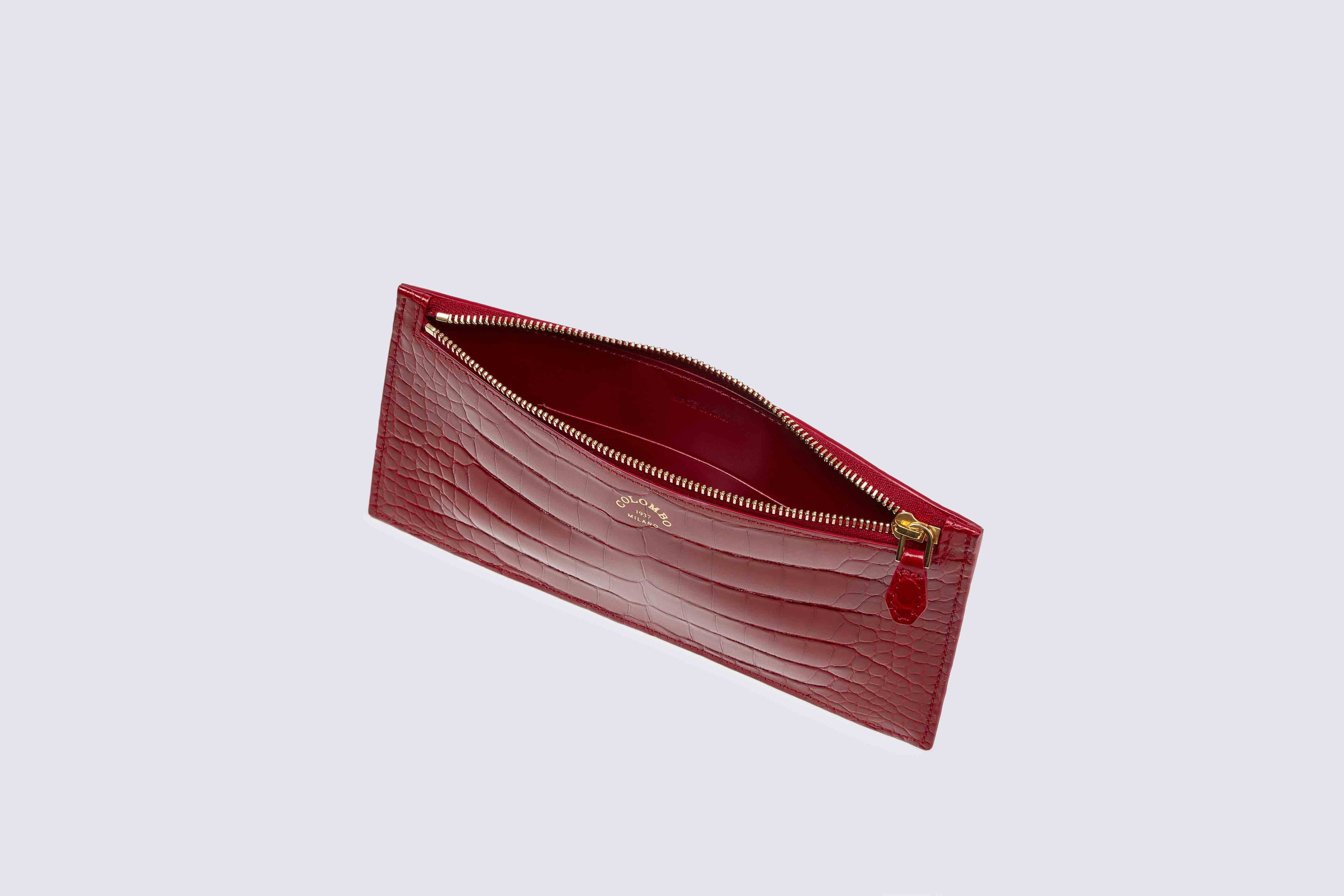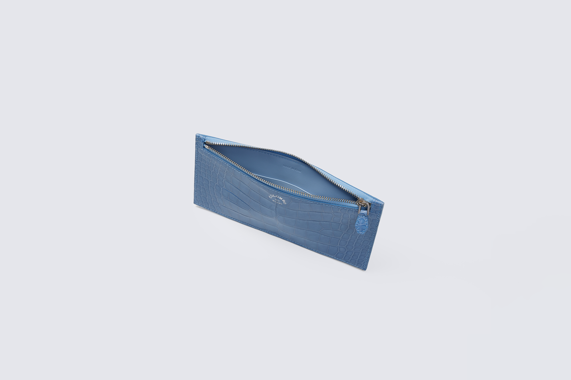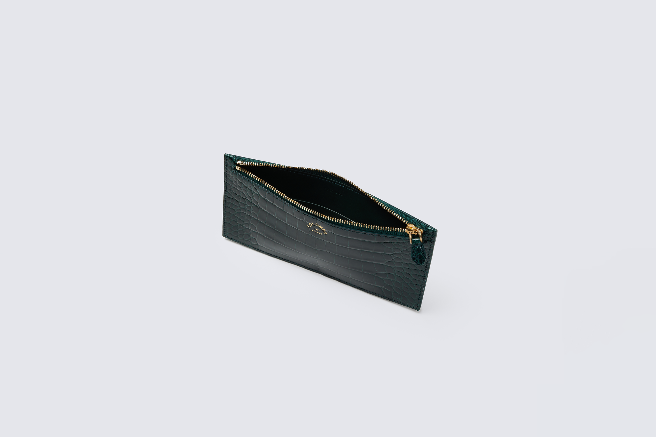 This model belongs to the long wallet line. It features a zip closure that opens to reveal an internal compartment. On the back, it includes six card slots.
